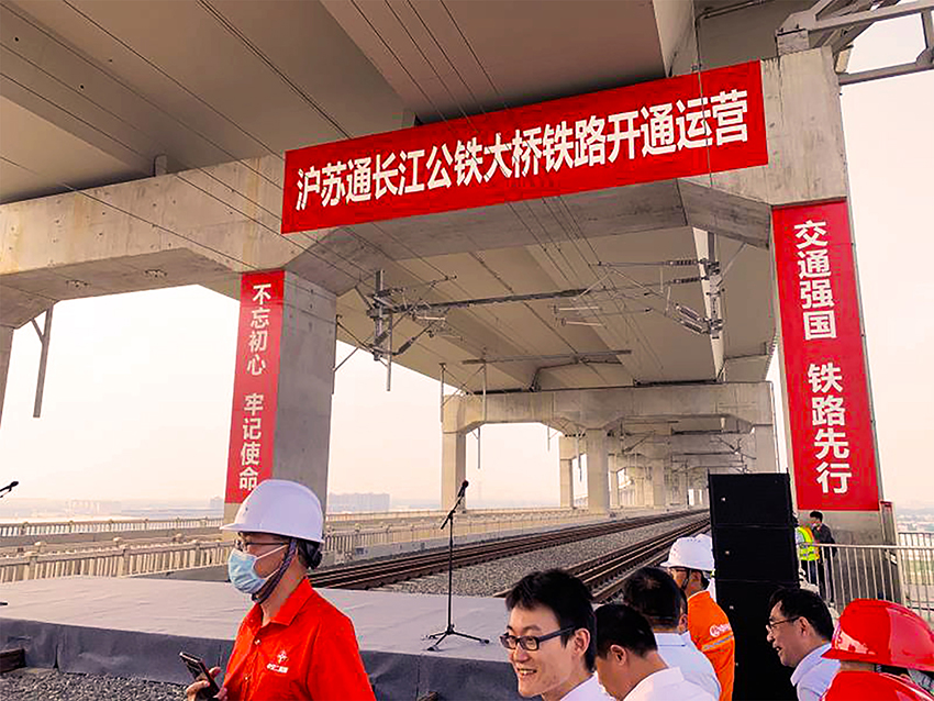 7月1日上午,第一座以长三角3座城市共同命名的跨江大桥——“沪苏通长江公铁大桥”在大桥的北桥堡举行了沪苏通长江公铁大桥铁路开通运营的活动,一列搭载着参建者代表的复兴号列车,由大桥北堡发车,驶向长江南岸。